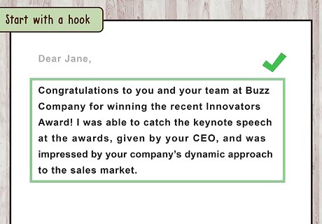 Start with a hook. The hook should praise the company on a recent accomplishment. Do some research to find a recent win by the employer that has happened within the past six months. This could be a recent award they received or a new facility they just established. Maybe they hit a recent sales goal or broke into a new market. Make the hook the first sentence of the letter. For example, you may write, “Congratulations to you and your team at Buzz Company for winning the recent Innovators Award! I was able to catch the keynote speech at the awards, given by your CEO, and was impressed by your company’s dynamic approach to the sales market.”