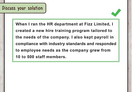 Discuss your solution to the hiring manager’s pain. In the third paragraph, tell a one to two sentence story that discusses your solution to the pain. Discuss a time when you addressed a similar business pain by listing your actions and your necessary expertise. This will let the reader know that you have the experience necessary to address their pain. For example, you may write, “When I ran the HR department at Fizz Limited, I created a new hire training program tailored to the needs of the company. I also kept payroll in compliance with industry standards and responded to employee needs as the company grew from 10 to 500 staff members.”
