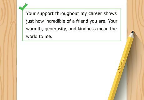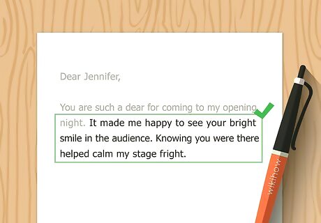 Let them know why their specific gift is cherished. Even if you don't absolutely love the gift, think about the trouble and expense the person went to for your benefit. Show them that this effort, and the gift itself, is important to you. Try to be honest and sincere. "She has been begging me for a pair of leggings lately! They fit her just right, and she has a red dress that matches them perfectly. They'll be put to good use this winter." "You are such a dear for coming to my opening night. It made me happy to see your bright smile in the audience. Knowing you were there helped calm my stage fright." "I am very grateful for your assistance with my senior project this semester. You have a lot of students depending on you, and I really appreciate your taking the time to give me so much individual attention." "You did not have to take the time to mentor and meet with me -- most people wouldn't -- but your passion and patience has left an impact on me that I will never wear out.