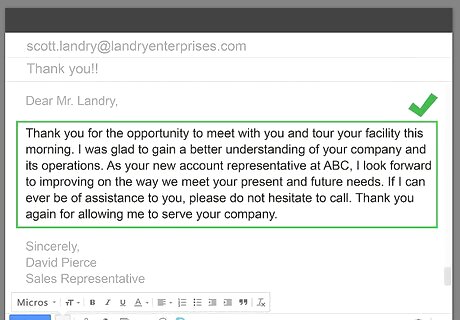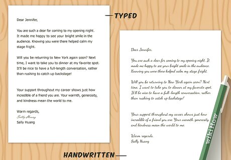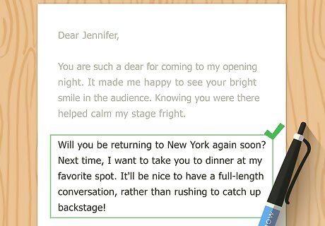 Inquire after the other person or share a little news. Now that you've expressed your gratitude, it's nice to write another few lines that show you care about the person. Ask some questions, and share information about your life. This makes all the difference between a dashed-off note and an actual thank you letter, and the recipient will take even more pleasure in receiving your words. For example, you could write, "It was fun to catch up with you at the party. How are things going with Bobby's soccer team? He has natural talent, that boy. Leigh has been asking about him every day. We can't wait to see you this Christmas." "Will you be returning to New York again soon? Next time, I want to take you to dinner at my favorite spot. It'll be nice to have a full-length conversation, rather than rushing to catch up backstage!" "I wish you the best with your research this summer, and look forward to seeing you at the NSTA conference in the fall." "Best of luck with your new responsibilities and projects. I'm eagerly awaiting the chance to see what you do next, and to keep learning from you from afar."