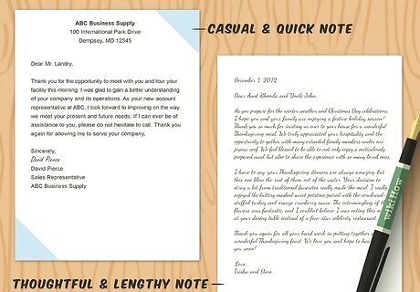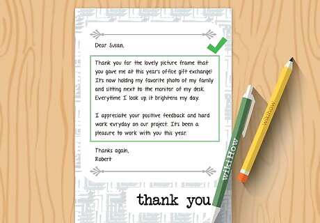 Match the length of the letter to the size of the gift. This is a very general rule that works pretty well in practice. A very thoughtful, expensive gift deserves a thoughtful, rather lengthy letter. A tiny gesture may be thanked with a casual, small gesture in return. Think about how much time, effort and money was put into the gift and match your letter's tone and length appropriately. For example, if someone bought you a $100 wedding present, in addition to flying to your wedding and taking time off work to attend, they deserve a full-blown thank you letter on nice paper or a big thank you card. On the other hand, if you were the recipient of a $5 Secret Santa stocking stuffer, a short, quick note will do.