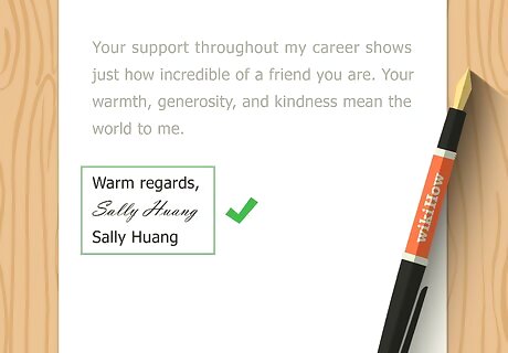 Close the letter. Think about the nature of your relationship and choose the closing that seems most appropriate. If you can't decide, it's fine to just sign your name. Here are a few examples of popular closings: To a loved one: Love, Much love, Hugs and Kisses, All my love, Yours, To a friend: Cheers, Thanks again, Warmly, See you soon, Many thanks, To a colleague: Sincerely, Gratefully yours, Respectfully yours, Best wishes