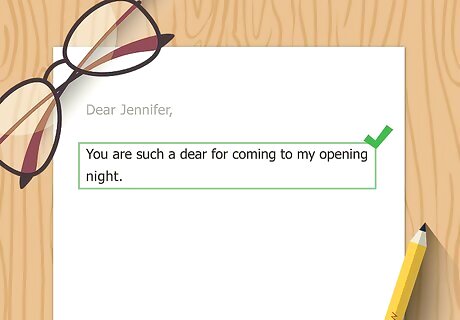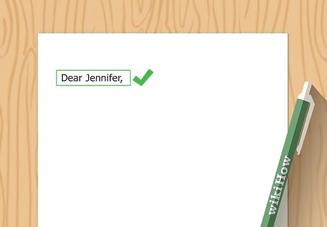 Open with a salutation. Begin your thank you letter by addressing the person in the way that feels most natural. In almost every situation, starting with "Dear [person's name]," is appropriate. Whether the note is for your best friend, your teacher or your mom, this works. If you're looking for something a little more personal, try: "Dearest __," "Hi, __," "My friend," "To my favorite _____,"
