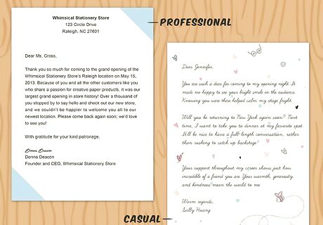 Make it professional or keep it casual. The style of your note will be a little different depending on who's receiving it. Keeping the nature of the gift in mind, think about what type of note would be most appropriate. No matter what, you want to leave the person receiving the note feeling that you're sincerely grateful. For example, if you're sending a thank-you note to your boss, and the workplace setting is pretty formal, you might want to choose high-quality business stationery, type the letter and format it according to the standards for a professional business letter. If the note is for a friend, you can show a little more personality. Write your note on a funny postcard, or make your own cool stationery.