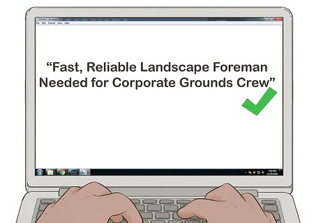 Start the ad with a job title that specifically describes the position. The job title might seem like an insignificant detail when you’re writing a job posting, but it’s the first thing candidates will see, and it will help them determine whether to click on the posting or to pass it over. Keep the title short and to-the-point, and avoid using uncommon words or phrases, as this will often cause your job to show up lower in a candidate’s job search. For example, "Entry-Level Architect" is a simple title that tells applicants exactly what they need to know. On the other hand, if you’re looking for a server for a restaurant, a post with a title like “Cheerful Team Member” might get overlooked in a search. It would be better to say something like “Day Shift Server.” You can get more creative in the body of the posting, if you want. Tip: If there’s a subject line for the posting, put the job title there as well.