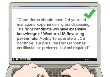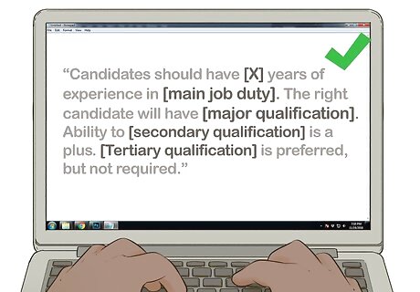 List the necessary experience and qualifications. Use the description of your ideal candidate to lay out the qualities, level of skill, and experience that your ideal applicants will have. Be specific here, as this will hopefully cut down on the amount of time you spend rejecting unfit applicants. Include the level of education the job requires, as well as the specific degree a candidate should possess, if there is one. Specify whether you require prior experience or training. For example, saying that you won't consider applicants without at least 3 years of experience will help ensure you don't have to review inexperienced candidates. You could list personal qualities here like speaking and personal skills. Keep in mind, however, that applicants could easily say that they have these traits in a cover letter and then try to fake them in an interview. Beware of this if you put personality traits in this section.