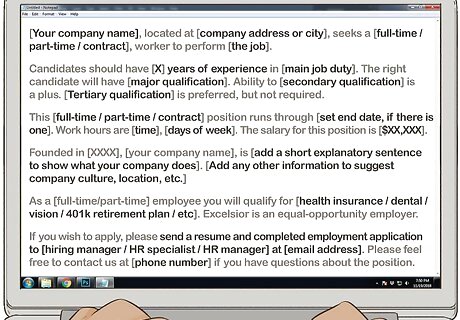 Proofread the ad. Like with any piece of writing, your ad should be carefully reviewed and proofread before you post it. Any spelling or grammar errors will make your company look unprofessional, and could discourage more qualified candidates from applying. You should also have at least one other person read it to make sure it's an effective ad. It can sometimes help to set the ad aside for a few hours, then return to it for proofreading.