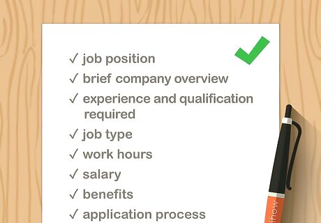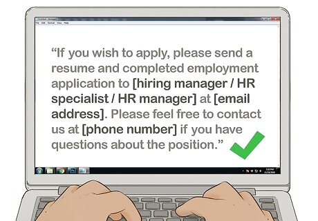 Include application instructions. Different jobs may have different application processes, and you should include instructions for applying. You may want a resume emailed to you with a specific subject line in the email, or you may prefer that the applicant apply through a third-party site. Whatever the process, include clear instructions so applicants know exactly what to do. This can often be as simple as a single line at the end of the job posting. If you want to ensure candidates have read the entire posting, you could include a special instruction for applying, like, "At the end of your email, answer the following question: 'If you could have dinner with any famous person, who would you choose?'"