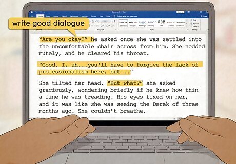Write good dialogue. Dialogue in a romance is really important. You need to use each interaction to build the attraction, romance, and sexual tension between the characters. Make sure your dialogue is gender specific. No matter if you are writing a story about a romance between a man and a woman, two men, or two women, you want your dialogue to ring true for them. Each character should have a different way of talking. This doesn't mean you should write them with heavy accents, but think about giving each character his or her own voice. Maybe one character talks too much, while the other character holds a lot back. Also think about phrases that each character might say often. Think about the way people talk around you. Listen to conversations and use that to help with your dialogue if you are having trouble. Make sure the dialogue is relevant to the plot. Don't have them talking about things that aren't important. Unlike real life, dialogue in a story needs to be purposeful.