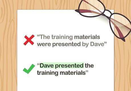 Write or speak in the active voice. Active voice is more engaging and straightforward than passive voice. It also uses fewer words, which can make it easier to get your point across and help your reader or listener understand the concepts better. For instance, a passive sentence is, “The training materials were presented by Dave.” An active sentence is, “Dave presented the training materials.”Tip: When writing in active voice, put the subject of the sentence first and ensure they are performing the action.