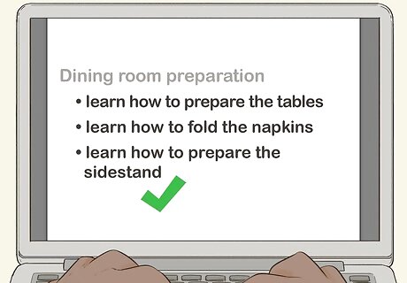 Explain how to meet each learning objective. Now is the time to describe the skills or knowledge that the participants need to know. Walk them through the process of completing the task or explain the information they need to meet the learning objectives. Develop activities to reinforce the knowledge and give the participants a chance to try each task on their own. To continue the example, you may give a presentation or provide screenshots that demonstrate how to input an order on a point of sale system.