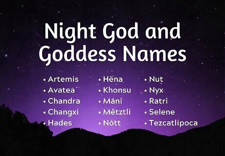 Opt for a name inspired by night, moon, or star deities. Most cultures have a god or goddess that’s associated with the night, the moon, or the stars. So, if you’re looking for a name with a bit more of a majestic or regal air, consider one of these: Artemis: Greek goddess of the hunt and wilderness who is associated with the moon. Avatea: Polynesian god of the moon and light. Chandra: Hindu god of the moon. Changxi: Chinese moon goddess. Hades: Greek god of the underworld who is associated with night and darkness. Hëna: Albanian goddess of the moon. Khonsu: Egyptian god of the moon. Máni: Norse god of the moon. Mētztli: Aztec goddess of the moon and night. Nótt: Norse goddess of the night. Nut: Egyptian goddess of the sky, stars, and cosmos. Nyx: Greek goddess of the night. Ratri: Hindu goddess of the night. Selene: Greek goddess of the moon. Tezcatlipoca: Aztec god of the night sky.