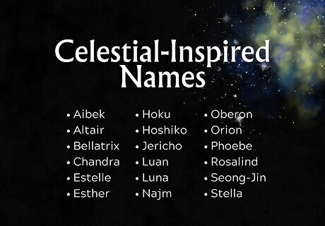 Pick a name that’s related to the night sky. The darkness of night is when you can finally see the moon and stars shining in the sky. So, consider choosing a celestial-inspired name for your little one! Hodgson says there are lots of names that mean “moon” or “star,” as well as names used to label stars, moons, and constellations in space. For example: Aibek: “Master of the moon,” Turkish/Kazakh origin (masculine). Alara: A moon of Jupiter, says Hodgson (feminine). Altair: A star in the Aquila constellation (gender-neutral). Andromeda: The closest galaxy to the Milky Way (feminine). Astra: “Star,” Latin origin (feminine). Astrophel: “Star lover,” Greek origin (masculine). Bellatrix: A star in the Orion constellation, says Hodgson (feminine). Cassiopeia: A constellation (feminine). Chandra: “Moon,” Sanskrit origin (gender-neutral). Cosmo: “Universe” or “order,” Greek origin (masculine). Cressida: A moon of Uranus, says Hodgson. Estelle: “Star,” Latin origin (feminine). Esther: “Star,” Hebrew origin (feminine). Hoku: “Star,” Hawaiian origin (masculine). Hoshiko: “Child of the star,” Japanese origin (feminine). Jericho: “City of the moon,” Arabic origin (masculine). Luan: “Moon,” Portuguese origin (masculine). Luna: “Moon,” Latin origin (feminine). Najm: “Star,” Arabic origin (masculine). Oberon: A moon of Uranus (masculine). Ophelia: A moon of Uranus, says Hodgson (feminine). Orion: A constellation (masculine). Phoebe: A moon of Saturn, says Hodgson. Rosalind: A moon of Uranus, says Hodgson (feminine). Seong-Jin: “Star” or “planet” + “town” or “marketplace,” Korean origin (masculine). Stella: “Star,” Latin origin (feminine). Stirling: “Little star,” British origin (masculine). Tara: “Star,” Sanskrit origins (gender-neutral). Tiên: “Celestial being,” Vietnamese origin (gender-neutral). Vega: A star in the Lyra constellation (feminine).