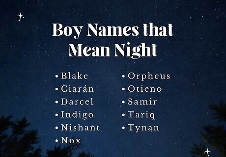 Select a masculine name for a boy. There are several boy names that translate to “night,” as well as names that are associated with darkness. Check out these night-inspired names from different cultures around the world: Blake: “Dark” or “Black,” British origin. Ciarán: “Little dark one,” Irish/Gaelic origin. Darcel: “Dark,” French/Irish origin. Indigo: Refers to the blue-violet color, like the night sky. Nishant: “End of the night,” Sanskrit origin. Nox: “Night,” Latin origin. Orpheus: “Darkness of night,” Greek origin. Otieno: “Born at night,” Kenyan/Tanzanian origin. Samir: “Companion in evening conversation,” Arabic origin. Tariq: “Night visitor” or “morning star,” Arabic origin. Tynan: “Dark” or “dusky,” Irish origin. Meet the wikiHow Expert Chloe Hodgson is a baby name expert.