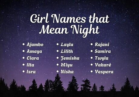 Choose a feminine name for a girl. There are also plenty of girl names that mean “night,” as well as names that refer to darkness, the evening, and twilight. Consider one of these names for your baby girl: Ajambo: “Born in the evening,” Kenyan/Tanzanian origin. Amaya: “Night rain,” Japanese origin. Ciara: “Little dark one,” Irish/Gaelic origin. Ilta: “Evening,” Scandinavian/Finnish origin. Isra: “Journey of the night,” Arabic origin. Koko: “Night” or “moon,” Native American (Blackfoot) origin. Layla: “Night,” Arabic origin. Lilith: “Belonging to the night,” Hebrew origin. Jemisha: “Queen of the night,” Hindu/Sanskrit origin. Miyu: “Beautiful evening,” Japanese origin. Nisha: “Night,” Indian origin. Rajani: “Dark one” or “darkness,” Sanskrit origin. Samira: “Companion in evening conversation,” Arabic origin. Twyla: “Twilight,” British origin. Vakarė: “Of the evening,” Lithuanian origin. Vespera: “Of the evening” or “evening star,” Latin origin.