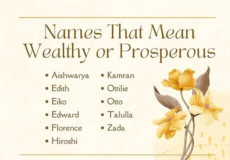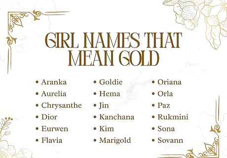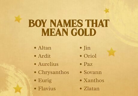 Select a name that’s related to riches and good fortune as an alternative. Gold is an extremely valuable metal, so why not choose a name that’s related to the prosperity and wealth it can bring? For example, check out these masculine, feminine, and gender-neutral names below: Aishwarya: “Prosperity” or “wealth,” Sanskrit origin (feminine). Edith: “Prosperous in war,” English origin (feminine). Eiko: “Flourishing” or “prosperous child,” Japanese origin (feminine). Edward: “Wealthy guardian,” English origin (masculine). Florence: “Prosperous” or “flourishing,” Latin origin (feminine). Hiroshi: “Prosperous,” Japanese origin (masculine). Kamran: “Prosperous” or “fortunate,” Persian origin (masculine). Ottilie: "Prosperity" or “riches,” German origin (feminine). Otto: “Wealthy,” German origin (masculine). Talulla: “Princess or abundance,” Irish origin (feminine). Zada: “Prosperous” or “fortunate,” Arabic origin (feminine).