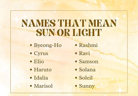 Choose a name that’s associated with gold, like “sun” or “light.” Sunshine is often described as golden rays of light, so consider choosing a name that means “sun” or “light.” While these masculine, feminine, and gender-neutral names don’t directly mean “gold,” they do evoke the warm, shining color. For example: Byeong-Ho: “Bright summer,” Korean origin (masculine). Cyrus: “Sun,” Persian origin (masculine). Elio: “Sun” or “sunlight,” Latin origin (masculine). Haruto: “Sun” or “sunlight,” Japanese origin (masculine). Idalia: “Behold the sun,” Greek origin (feminine). Marisol: “Sea and sun,” Spanish origin (feminine). Rashmi: “First ray of light,” Sanskrit origin (gender-neutral). Ravi: “Sun,” Sanskrit origin (masculine). Samson: “Sun” or “sun child,” Hebrew origin (masculine). Solana: “Sunshine,” Spanish origin (feminine). Soleil: “Sun,” French origin (feminine). Sunny: “Full of sunshine,” English origin (gender-neutral). Surya: “Sun,” Sanskrit origin (masculine).