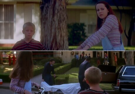 With his parents gone, Donnie throws a Halloween party, then he goes to see Grandma Death. Donnie's older sister Elizabeth (played by his IRL sis, Maggie Gyllenhaal) gets into Harvard, so they decide to throw a Halloween party to celebrate. Gretchen arrives at the party upset, as her mother has gone missing, and she and Donnie have sex for the first time. Donnie remembers that Frank's prophesied apocalypse is only a few hours away, so he takes Gretchen and some friends to see Grandma Death. They find two high school bullies trying to rob Grandma Death's home. The boys fight, and Gretchen falls into the street, where a car hits and kills her. The driver turns out to be Donnie's older sister Elizabeth's boyfriend, Frank, wearing the same rabbit costume from Donnie's vision. Donnie, distraught, shoots Frank in the eye with his father's gun. Grandma Death tells Donnie a storm is coming, and he walks home with Gretchen's body.
