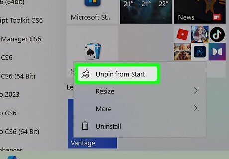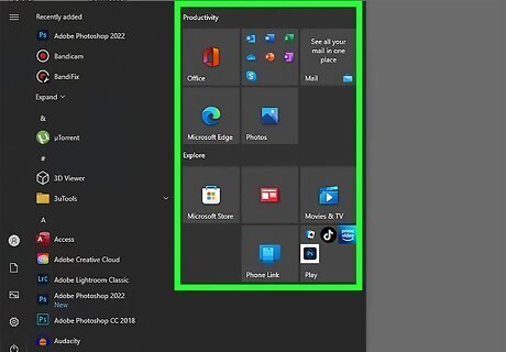 Pin or input shortcuts and apps. The tiles section is handy for finding apps quickly without having to scroll all the way through the alphabetical list. If there's a tile you don't want to see on the Start menu, right-click it and select Unpin from Start. To add a program to the pinned tile list, type the name of the program into the search bar at the bottom. When the program appears, right-click it, then select Pin to Start.