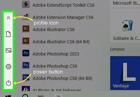 Find the account section of the Start menu. The Windows 10 Start menu is divided into three general areas. First, familiarize yourself with the account section, which is at the bottom-left corner of the menu. Here, you will see your profile icon, the power button, and other shortcuts. Click your profile picture to access your account settings or switch to a different account. If you click the power button, you will see options to restart or shut down your computer. Clicking the gear icon will open your Windows settings. From the Settings menu, you can personalize your desktop, connect to the internet, set time and language, set privacy options, update Windows, and more. You can also customize the account section to add shortcuts to commonly-used features. We'll cover customizing the Start menu a little later.