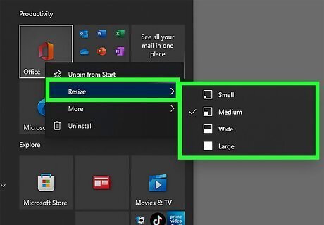 Configure the tiles. By default, the tile area is divided into subsections like “Life at a glance,” "Productivity," and "Play and explore,” each of which contains tiles. To resize a tile, right-click (or tap and hold) the tile, place the mouse on Resize in the context menu, and select a size. Four size options will be presented to you: small, medium, wide, and large. To move a tile, click and drag it wherever you'd like within the tile area. To create a tile folder, drag and drop one tile onto another. This creates a folder, or group, for the tiles. Continue adding tiles by dragging more into the group. To turn live tile on or off, right-click (tap and hold) the tile and click/tap Turn live tile on (or off).