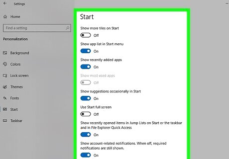 Use the personalization options to customize the Start menu. Once you're in the menu, you have plenty of options to make the Start menu look how you want. To turn a feature on or off, click its corresponding toggle switch: If you don't want to see recently added apps at the top of your app list, you can toggle off "Show recently added apps." By default, the Start menu will show your most used apps. You can toggle this off if you'd like. If you don't want to see suggestions for apps to download or install, you can toggle off "Show suggestions occasionally in Start." To make the Start menu take up the whole screen, click the switch next to "Use Start full screen" to turn it on. This will give your Windows 10 computer a more Windows 8-style feel. If you want to be able to easily find files you've opened or worked on recently, toggle on "Show recently opened items in Jump Lists on Start or the taskbar and in File Explorer Quick Access." At the bottom of the panel, you can click Choose which folders appear on Start to add or remove specific folders to or from the account area of the Start menu. Close the window when you're finished.